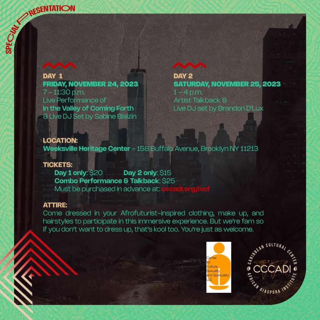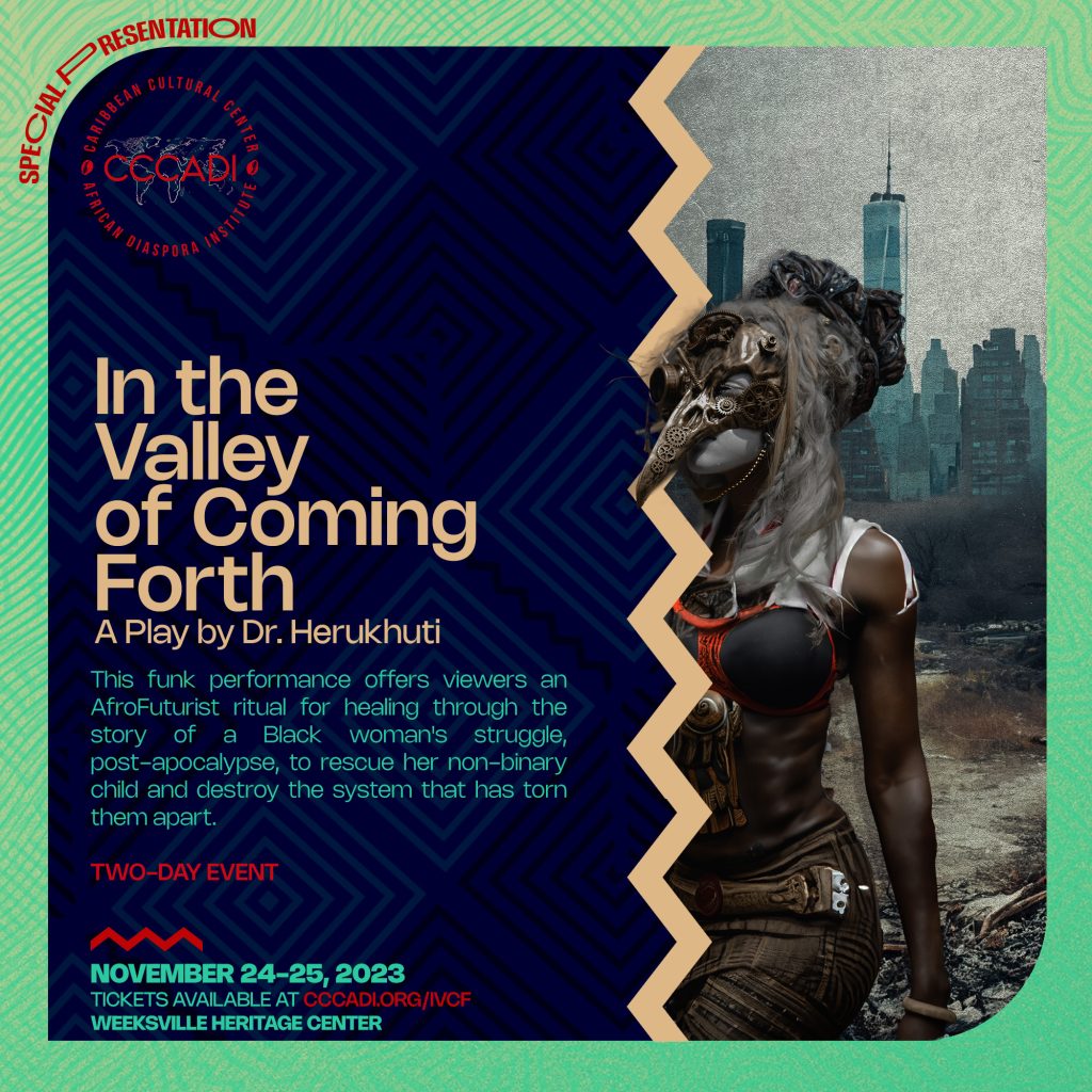 On November 24-25, 2023, the premier performance of “In the Valley of Coming Forth,” an Afrofuturist play by Dr. Herukhuti, takes over the Weeksville Heritage Center in Brooklyn. This alternative Thanksgiving weekend event presented by the Caribbean Cultural Center African Diaspora Institute tackles themes of European settler-colonialism, imperialism and white supremacy through the story of a Black woman’s struggles, post-apocalypse, to save her non-binary child in the year 2169. The two-day event includes an artist talkback and live DJ sets. Guests are invited to attend in Afrofuturist attire!
