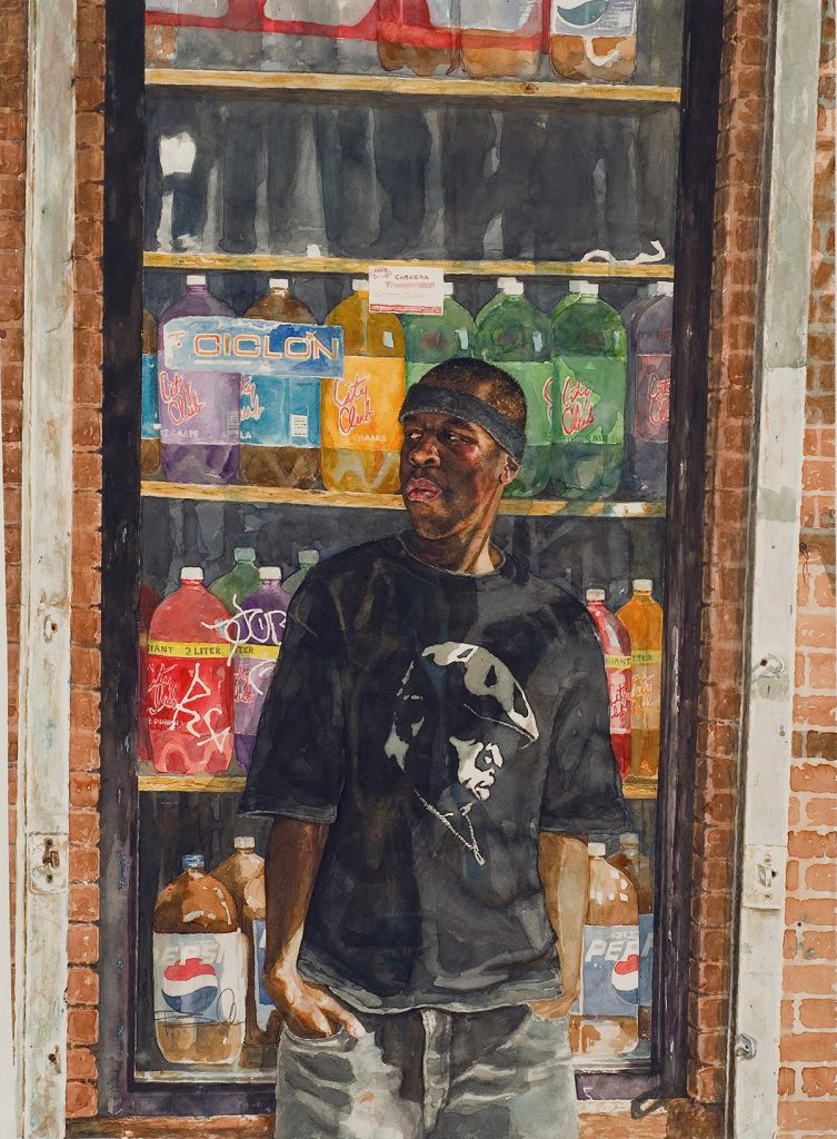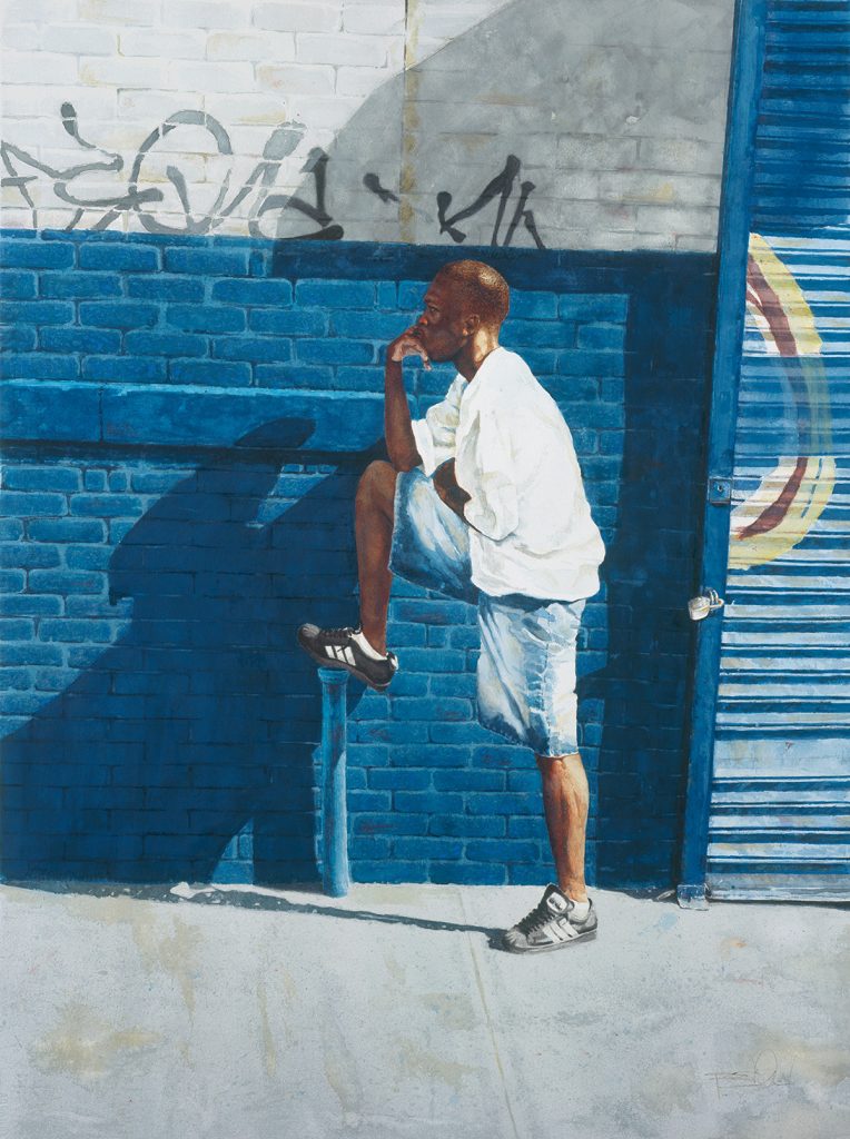 Smallwood is striving for the seamless surface of a constructed realism. His subjects are tightly drafted with keen attention to perspective, form and how the light spectrum falls on the subject to tell the visual story. These elements are most apparent in his subject’s skin tone, which has a smooth finish that reflects his fascination with both figure drawing and watercolor painting.