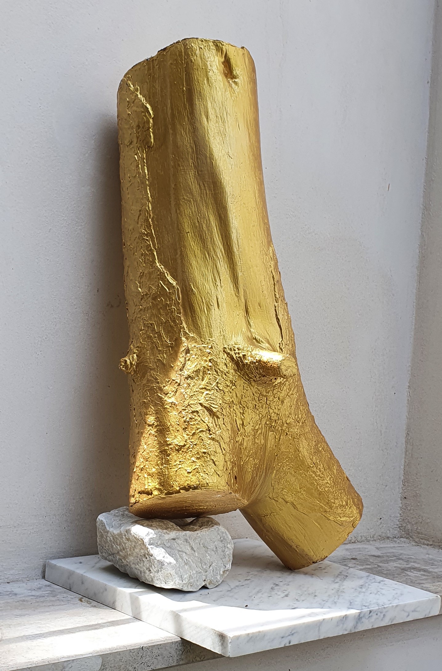 GLEIZER: One day in Miami, I saw this massive piece of a tree that was one meter and a half tall by fifty centimeters wide in diameter. A couple of guys helped me carry it up to my balcony.This was several years ago. I started experimenting how to paint it gold. Eventually, I painted it gold, and when the sun hit it, it was wonderful to see. It’s still there. And then, I found a huge piece of driftwood on the beach, on First Street, in South Beach. I suspect that piece of driftwood came there with a storm surge.That’s the only force that could have moved it there. I painted this piece of driftwood gold. It’s very flashy, just like Miami. And all day, there are different sun-rays bouncing around on it.