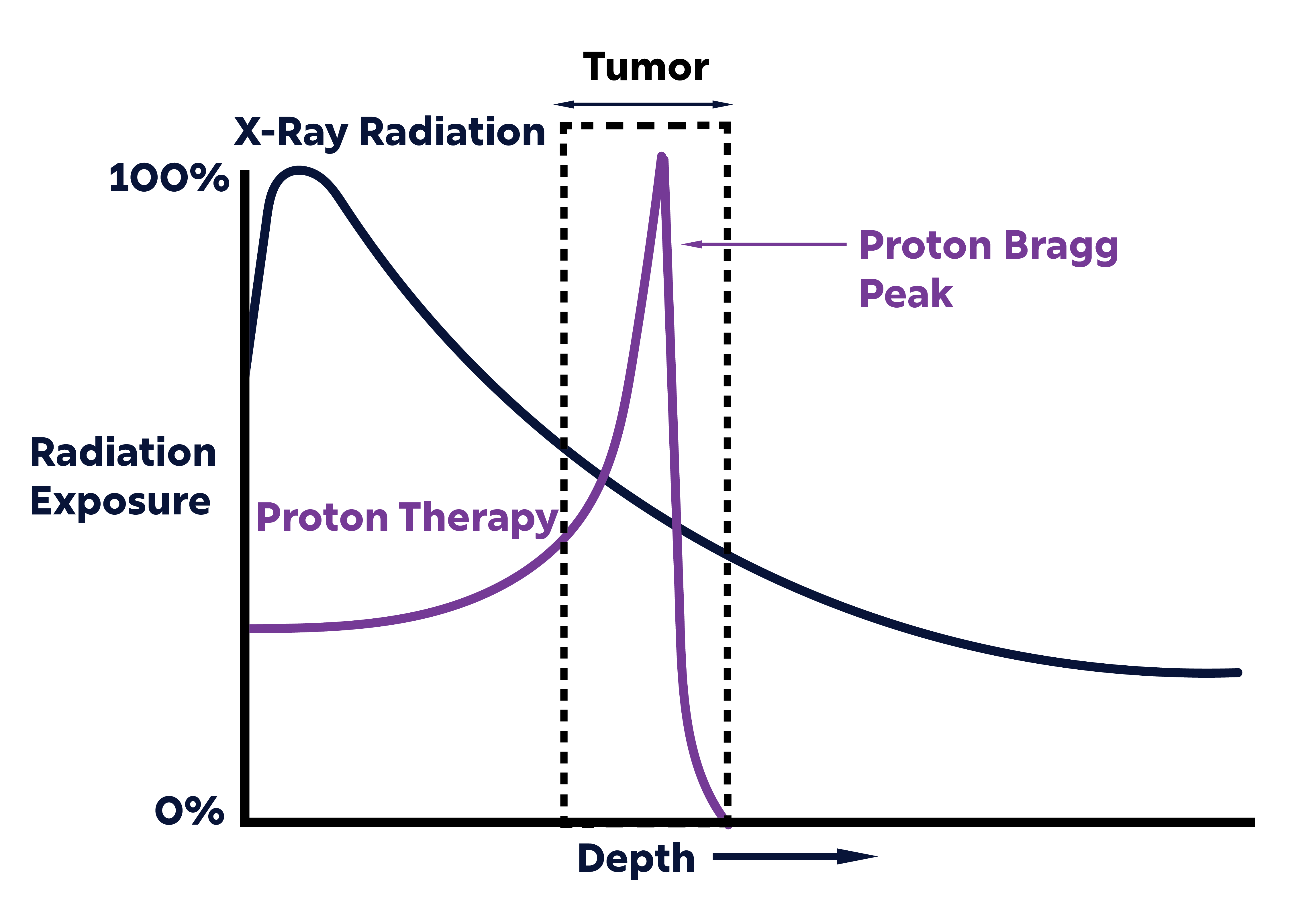 Graphical depiction of a Bragg peak used in proton beam therapy compared to standard radiation. Data from Lapen, K., & Yamada, Y. (2023). The Development of Modern Radiation Therapy. Current Physical Medicine and Rehabilitation Reports11(2), 131-138.