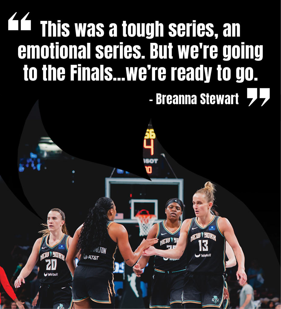 After the cathartic win, Sabrina Ionescu credited the home crowd for their momentum-shifting presence, especially seeing New York City increasingly get behind the team throughout her career. “Getting drafted here and being able to be a part of this organization from when there were 3,000 people in the stands to now, with there being a sellout…it feels like you can almost achieve anything in this building.”