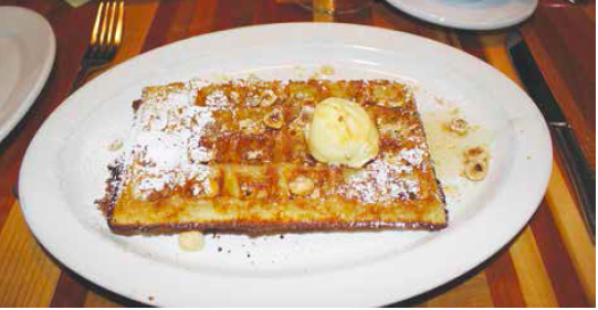 Long chewy al dente noodles entwined silky soft jalapeno pepper squares and crunchy chopped almonds in the Bucatini with Almond Pesto ($16). With no basil in sight, this “pesto” sauce was succulent and rich, with serious peppery heat. Also featured on Amis’ dinner menu, this dish composed of an unexpected combination of ingredients, delights, and surprises. Small and rectangular, the thin Belgian Waffle’s crisp exterior hid within a light and airy center ($12). Already sweetly drizzled with maple syrup and enriched with chopped hazelnuts, it boasted a European flair. An ice-cold sphere of salted butter flavored semifreddo — an Italian dessert similar to ice cream — sat stationary atop, and instead of melting and mixing with the syrup, remained chilled and solid.