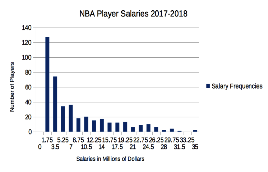 The graph below, based on NBA data from basketball-reference.com, illustrates the distribution of player salaries: The majority players in the NBA receive around $1 million to $7 million whereas there are just two players who receive the highest salary of nearly $35 million. The median salary of an NBA player in 2017 is about $3.3 million.